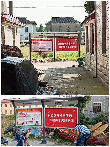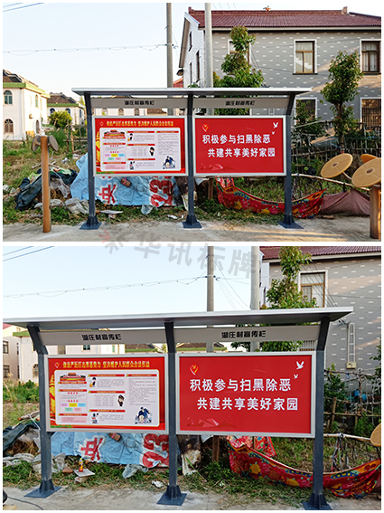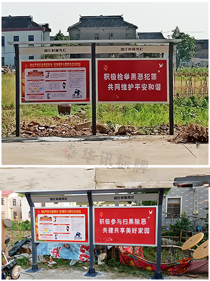 今天给大家带来华讯为常熟胡庄村设计制作安装的不锈钢户外宣传栏。来看看成品吧。