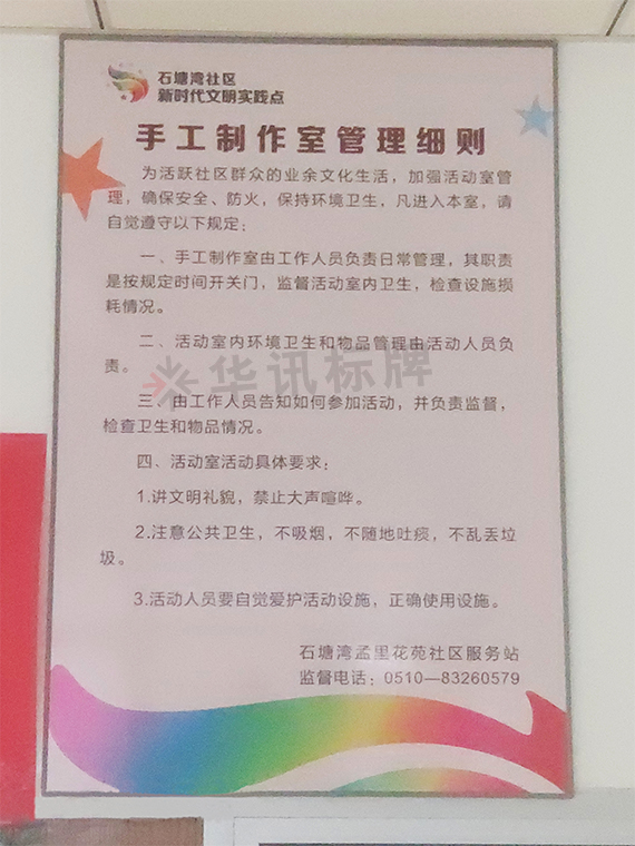 文化背景墙的建设,切实加强了全体工作人员对党性修养的理解和认识,激发干部职工的积极性和创造性,加快推进党建文化的传播,为地区党建精神以及事业持续稳步发展创造了和谐的氛围。这次华讯标牌为石塘湾社区制作了一批党建标识牌,其中有门头牌、管理制度牌,文化背景墙等。来看看师傅现场发回的照片吧。